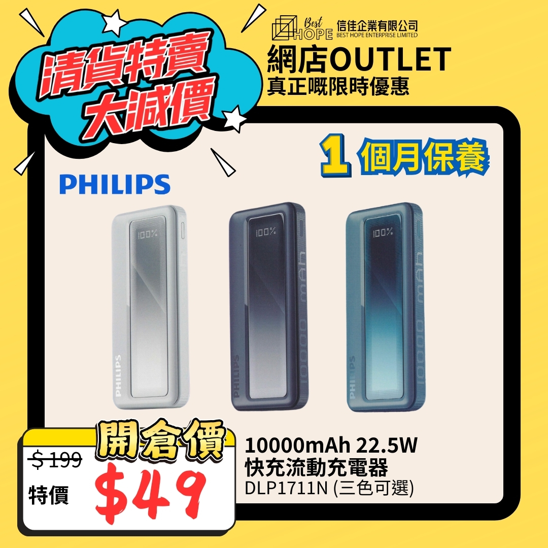 [開倉價$49!] PHILIPS 10000mAh 快充流動充電器 DLP1711N (三色可選)