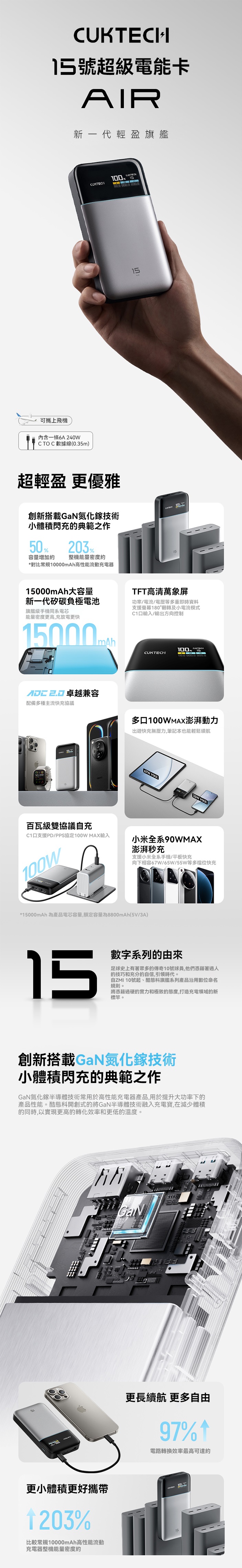 新一代GaN晶片:運用氮化鎵技術,轉換效率高、發熱低,支援UFSC融合快充等多種快充協議,廣泛兼容各類裝置。