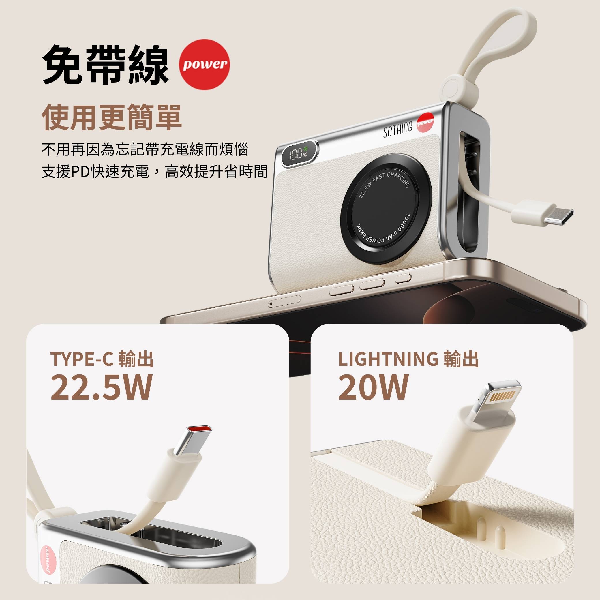 自帶USB-C及Lightning充電線掛繩設計並通過抗拉扯測試